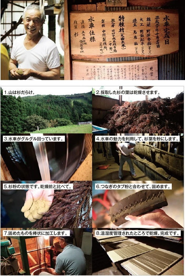 「馬場水車場のお香」の生産地は九州の八女市。杉の伐採や間伐後の杉が原料です。
