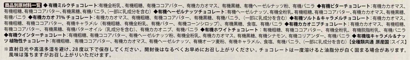 有機カカオマス、有機粗糖、有機ココアバター、有機黒糖、有機バニラ(原材料の一部に乳を含む ※注)